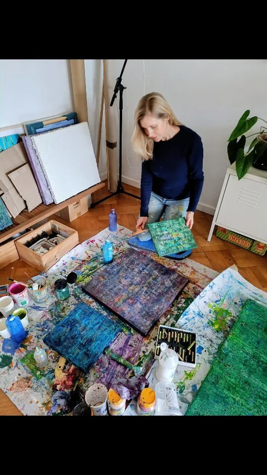 For my paintings, I find inspiration in nature, colors and during travels. I capture the immersive energy of lush healing forests, gemstones, blue lagoons and wild oceans.